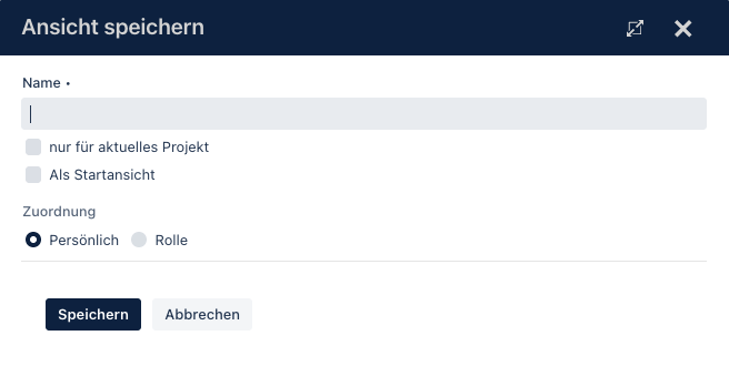 Dabei kann ich wählen, ob die Ansicht lediglich für das aktuell ausgewählte Projekt verfügbar sein soll, ob es sich um die Startansicht handeln soll und ob es eine persönliche oder eine rollenspezifische Ansicht ist.
