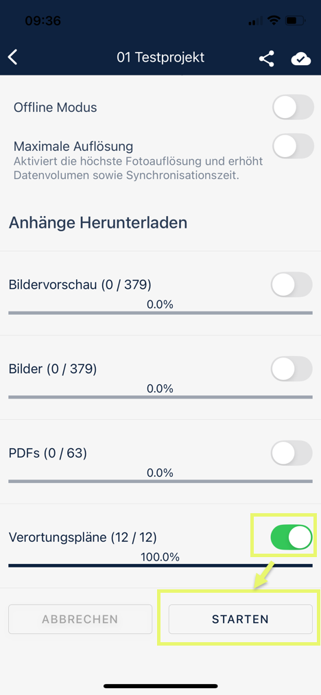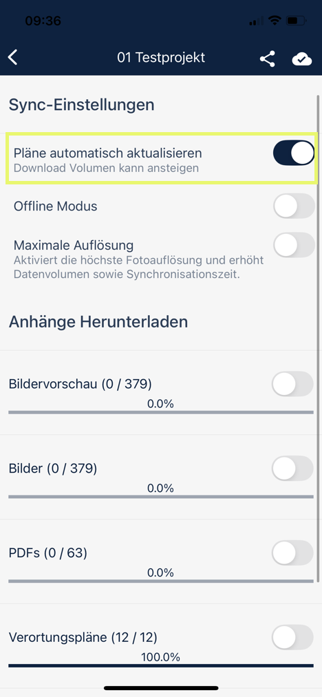Besonders für die Verortungspläne hilft die Einstellung Pläne automatisch aktualisieren, wobei die Verortungspläne automatisch in der regulären Synchronisation geladen werden.