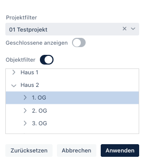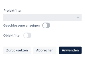 Wenn ich das Filter-Symbol anwähle, öffnet sich ein Pop-Up Fenster, in dem mir Optionen für Projekt- und Objektfilter angezeigt werden: